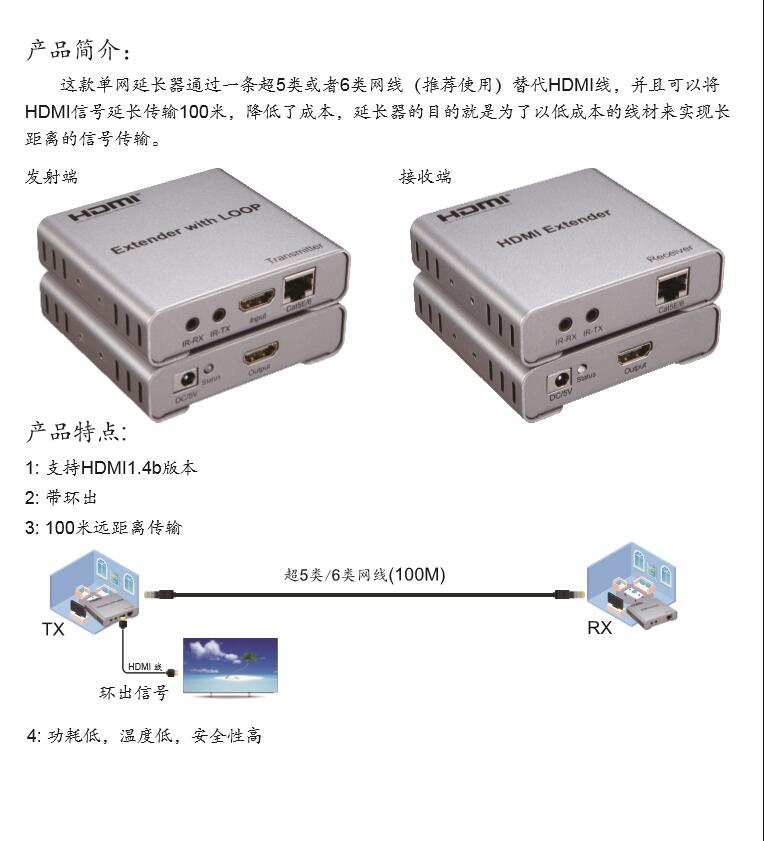 This affordable HDMI over Cat5/6 extender set consists of a HDMI over Cat5/6 transmitter unit nd a HDMI over Cat5/6 receiver unit and supports the transmission of HDTV resolutions up to FullHD/ 1080p60 (1920x1080 @60Hz) over distances up to 100m via a CAT6 cable.